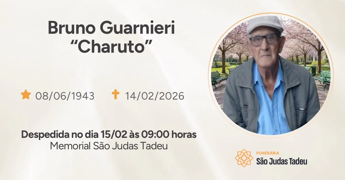 Funerária São Judas Tadeu e os familiares Bruno Guarnieri , mais conhecido por Charuto, residente em Videira comunicam com profundo pesar o seu falecimento ocorrido dia 14/02 aos 82 anos de idade.