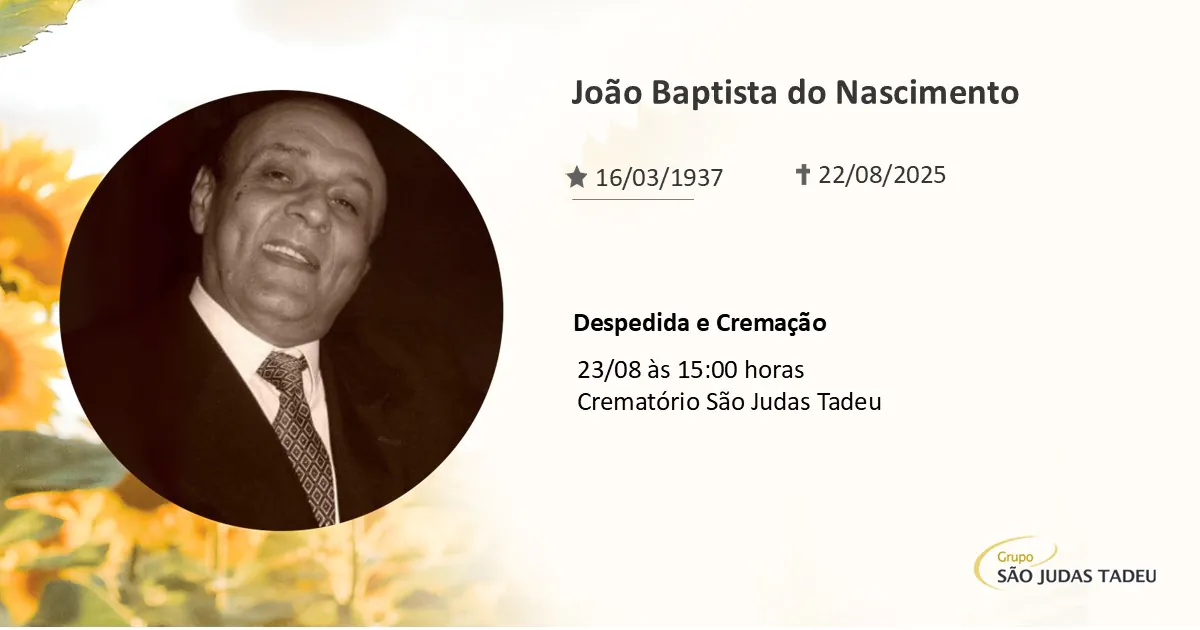 Funerária São Judas Tadeu e os familiares de João Baptista do Nascimento, residente na cidade de Clevelândia, Paraná, comunicam com profundo pesar o seu falecimento ocorrido dia 22/08 aos 88 anos de idade.