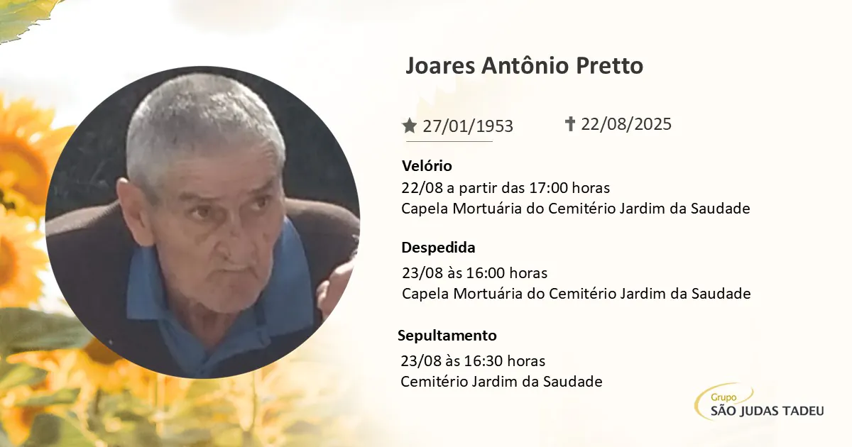 Funerária São Judas Tadeu e os familiares de Joares Antonio Pretto, residente em Videira no Bairro Santa Tereza, comunicam com profundo pesar o seu falecimento ocorrido dia 22/08 aos 72 anos de idade.