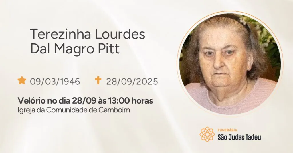 Funerária São Judas Tadeu e os familiares de Terezinha Lourdes dal Magro Pitt, residente na Comunidade de Camboim, Videira, comunicam com profundo pesar o seu falecimento ocorrido dia 28/09 aos 79 anos de idade. O velório será na Igreja da Comunidade de Camboim, dia 28/09 a partir das 13:00 horas. A celebração de despedida será […]