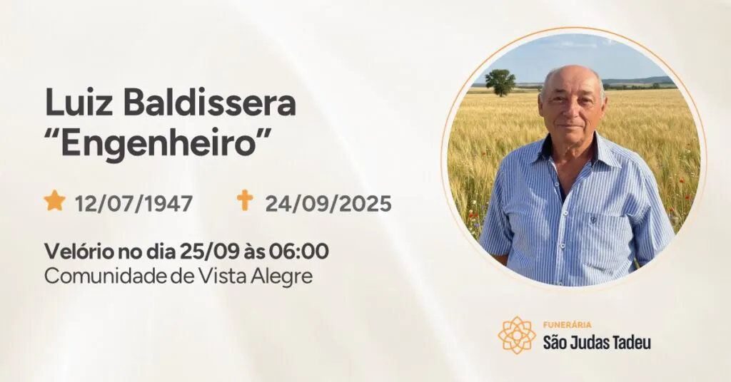 Funerária São Judas Tadeu e os familiares de Luiz Baldissera, mais conhecido como “Engenheiro”, comunicam com profundo pesar o seu falecimento ocorrido dia 24/09 aos 78 anos de idade. O velório será na Capela Mortuária da Comunidade de Vista Alegre, dia 25/09 a partir das 06:00 horas. A celebração de despedida será dia 25/09 às […]