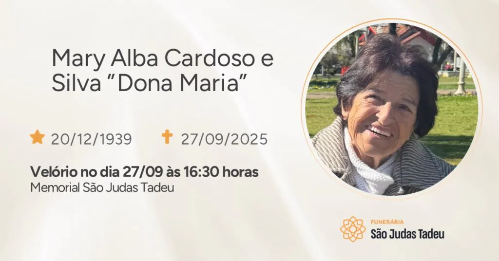 Funerária São Judas Tadeu e os familiares de Mary Alba Cardoso e Silva, mais conhecida como “Dona Maria “, comunicam com profundo pesar o seu falecimento ocorrido dia 27/09 aos 85 anos de idade. O velório será no Memorial São Judas Tadeu, dia 27/09 a partir das 16:30 horas. A celebração de despedida será dia […]