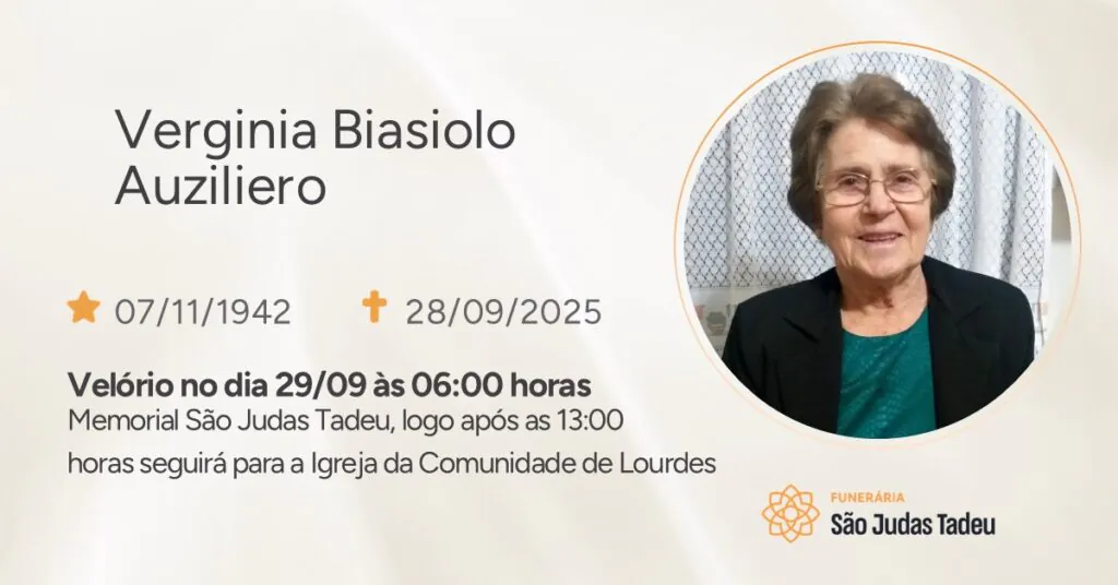 Funerária São Judas Tadeu e os familiares de Verginia Biasiolo Auziliero, comunicam com profundo pesar o seu falecimento ocorrido dia 28/09 aos 82 anos de idade. O velório será no Memorial São Judas Tadeu, dia 29/09 a partir das 06:00 horas. Logo após, seguirá para a Igreja da Comunidade de Lourdes as 13:00 horas. A […]