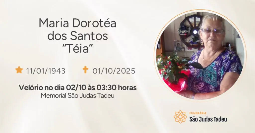 Funerária São Judas Tadeu e os familiares de Maria Dorotéa dos Santos, carinhosamente conhecida por “Téia”, comunicam com profundo pesar o seu falecimento ocorrido dia 01/10 aos 82 anos de idade. O velório será no Memorial São Judas Tadeu, dia 02/10 a partir das 03:30 horas. A celebração de despedida será dia 02/10 às 16:00 […]
