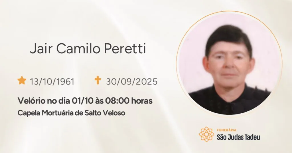 Funerária São Judas Tadeu e os familiares de Jair Camilo Peretti, comunicam com profundo pesar o seu falecimento ocorrido dia 30/09 aos 63 anos de idade. O velório será na Capela Mortuária de Salto Veloso, dia 01/10 a partir das 08:00 horas. A celebração de despedida será dia 01/10 às 16:00 horas, seguindo logo após […]