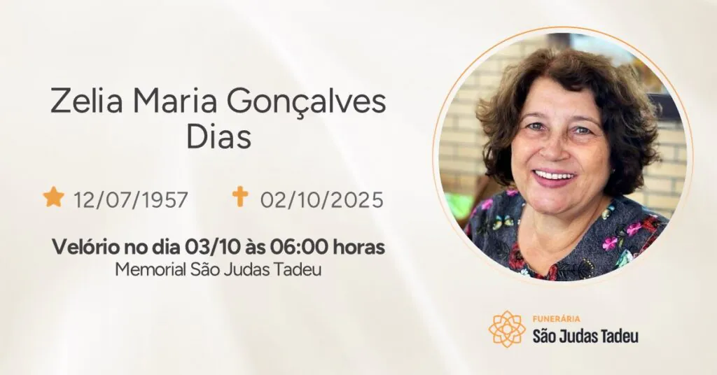 Funerária São Judas Tadeu e os familiares de Zelia Maria Gonçalves Dias, comunicam com profundo pesar o seu falecimento ocorrido dia 02/10 aos 68 anos de idade. O velório será no Memorial São Judas Tadeu, dia 03/10 a partir das 06:00 horas. A celebração de despedida será dia 03/10 às 16:30 horas, seguindo logo após […]