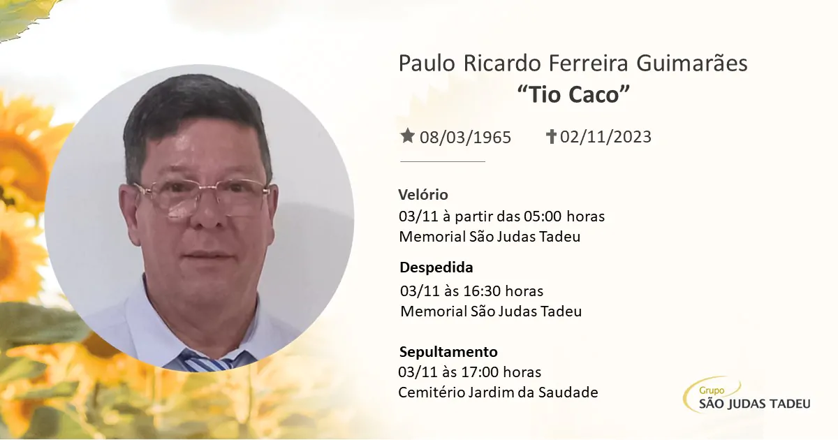Funerária São Judas Tadeu e os familiares de Paulo Ricardo Ferreira Guimarães, mais conhecido como “Tio Caco”, residente em Videira no Bairro Vila Verde, comunicam com o profundo pesar o seu falecimento ocorrido dia 02/11 aos 58 anos de idade.