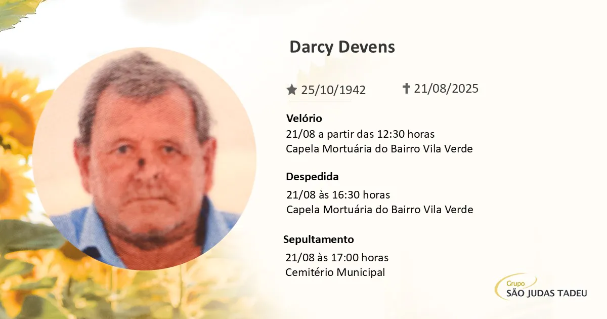 Funerária São Judas Tadeu e os familiares de Darcy Devens, residente em Videira no Bairro Vila Verde, comunicam com profundo pesar o seu falecimento ocorrido dia 21/08 aos 82 anos de idade.