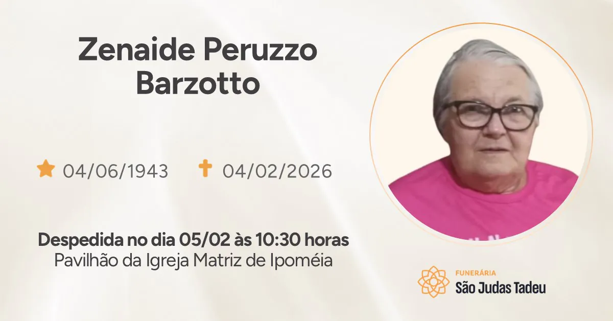 Funerária São Judas Tadeu e os familiares de Zenaide Peruzzo Barzotto, residente em Ipoméia, comunicam com profundo pesar o seu falecimento ocorrido dia 04/02 aos 82 anos de idade.